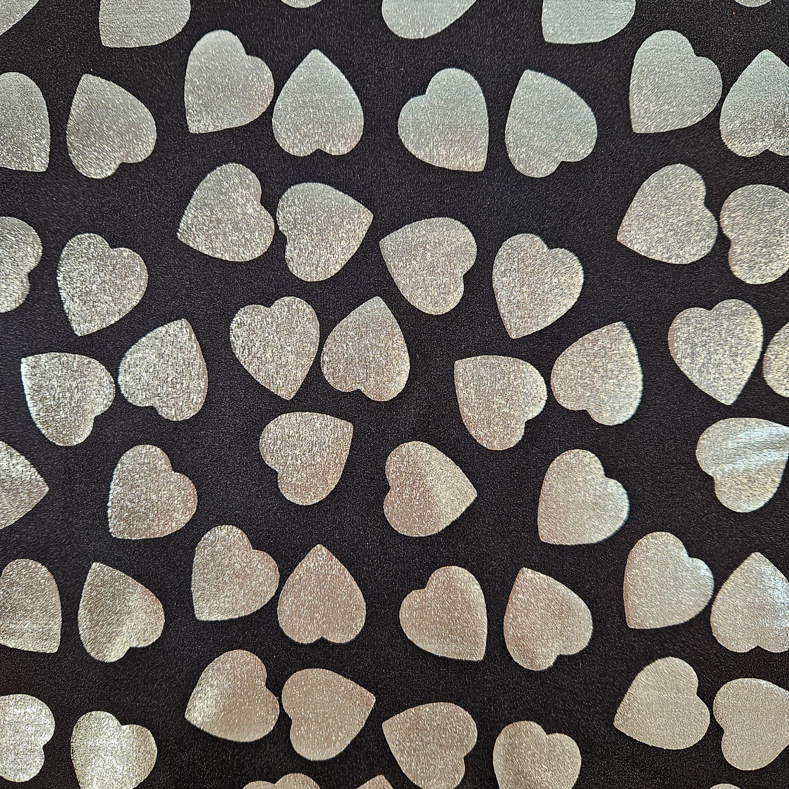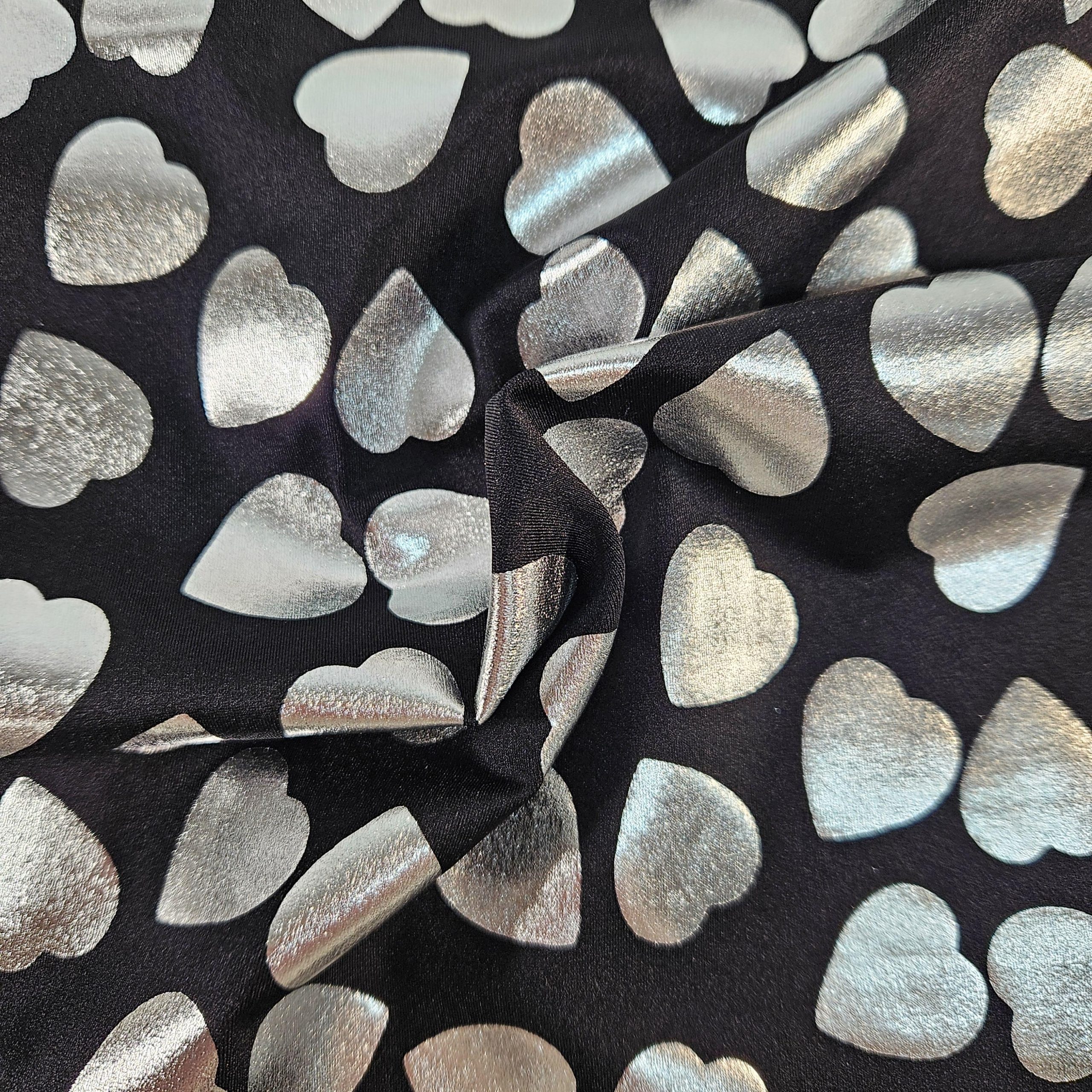 Silver foil heart patterned, stretch fabric ideal for dance and stagewear.