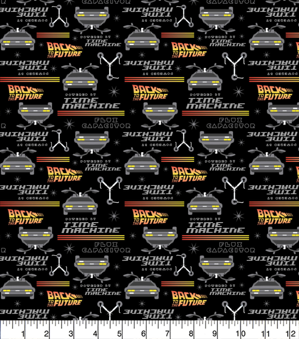 A printed cotton fabric featuring Back to The Future.