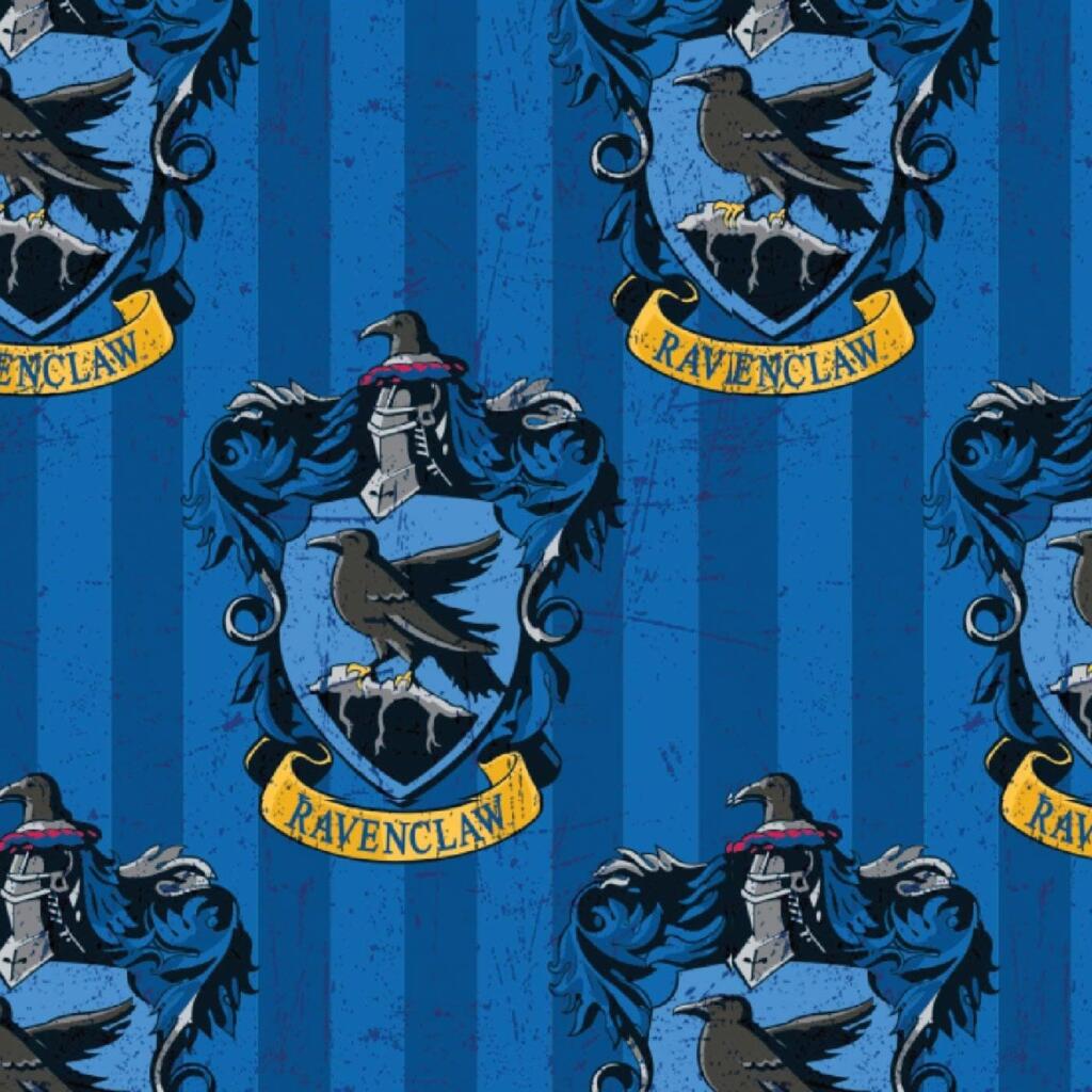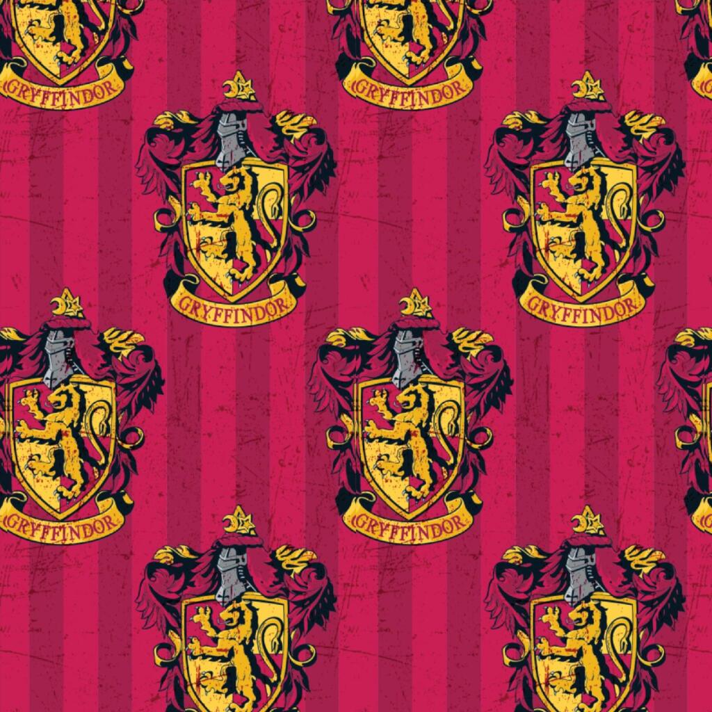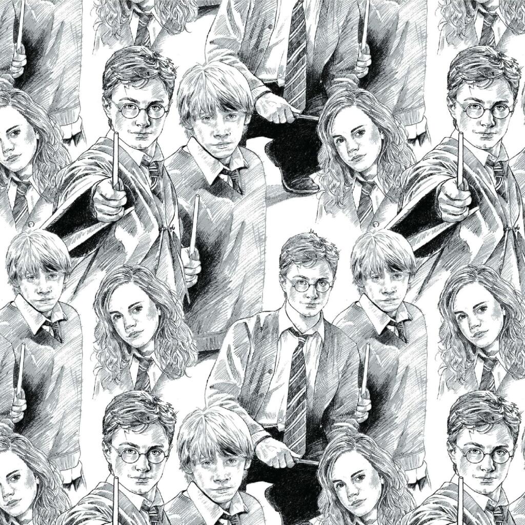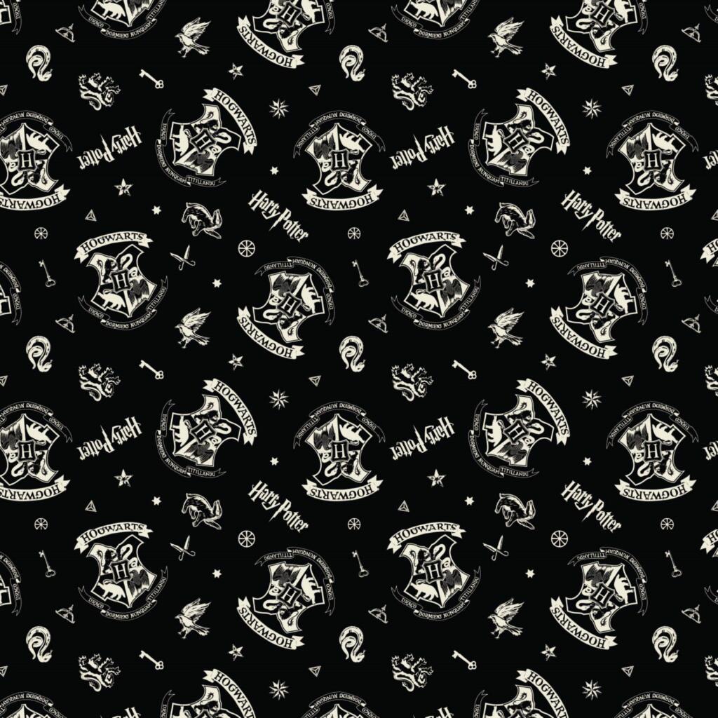 A printed cotton fabric featuring iconic characters and house insignia from Harry Potter.