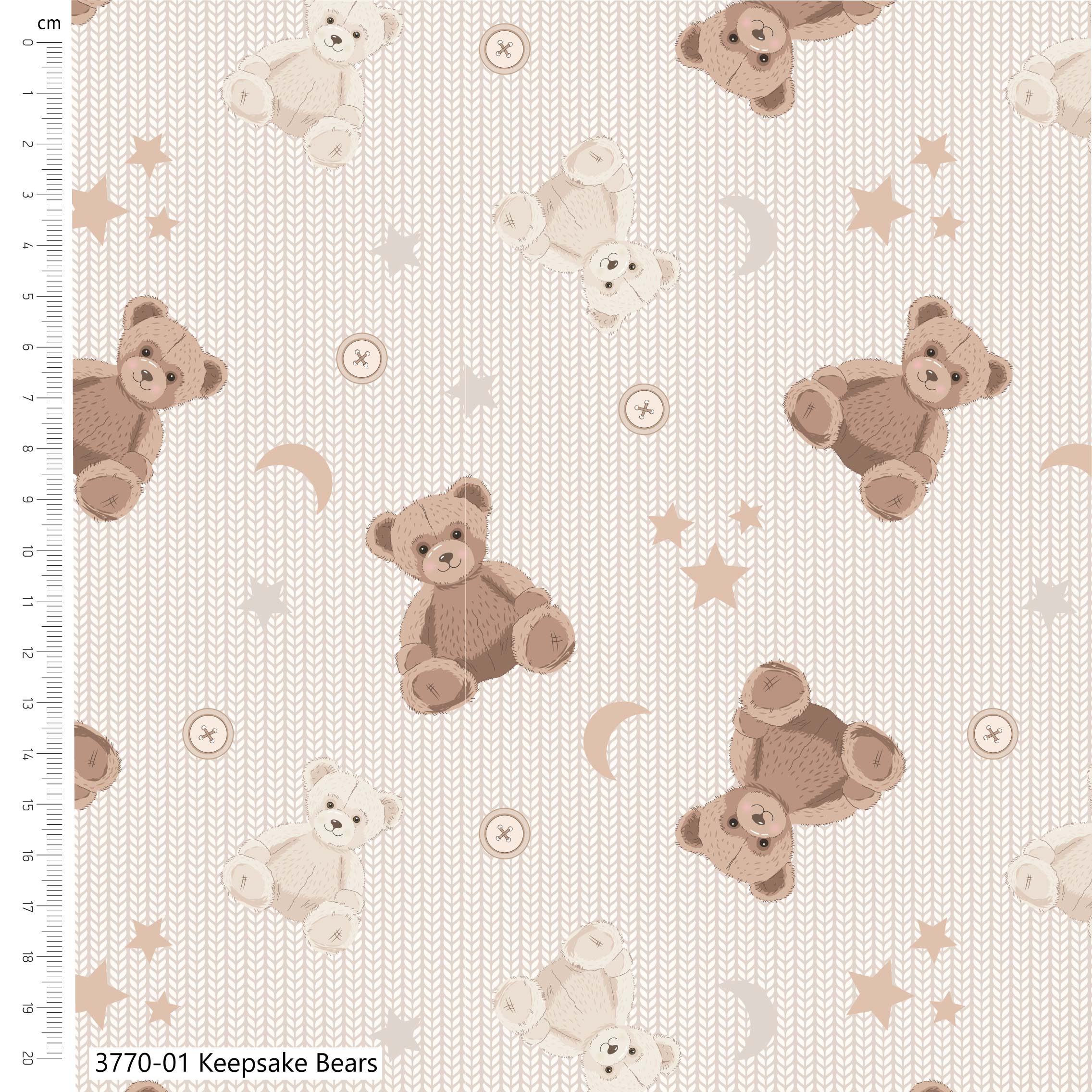 A children’s fabric collection featuring cute teddy bears, rabbits and buttons in subtle nursery colours. Printed on 100% cotton. These prints are perfect for childrens crafing, clothing, nursery items and quilts.