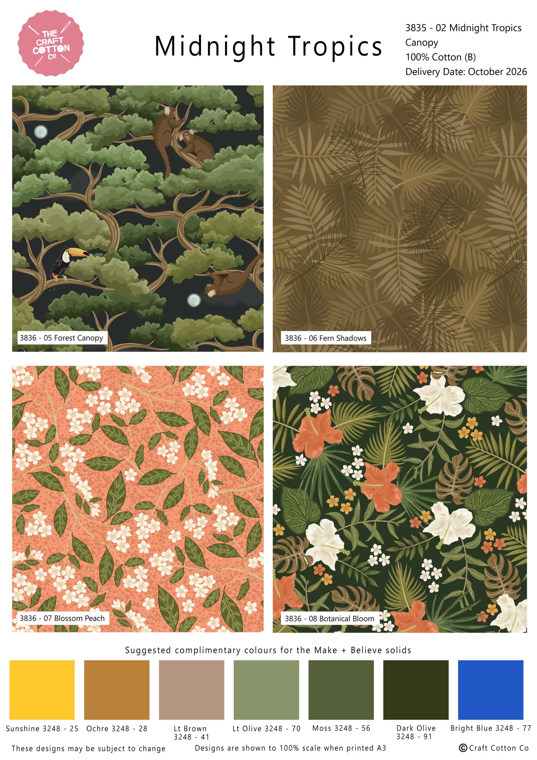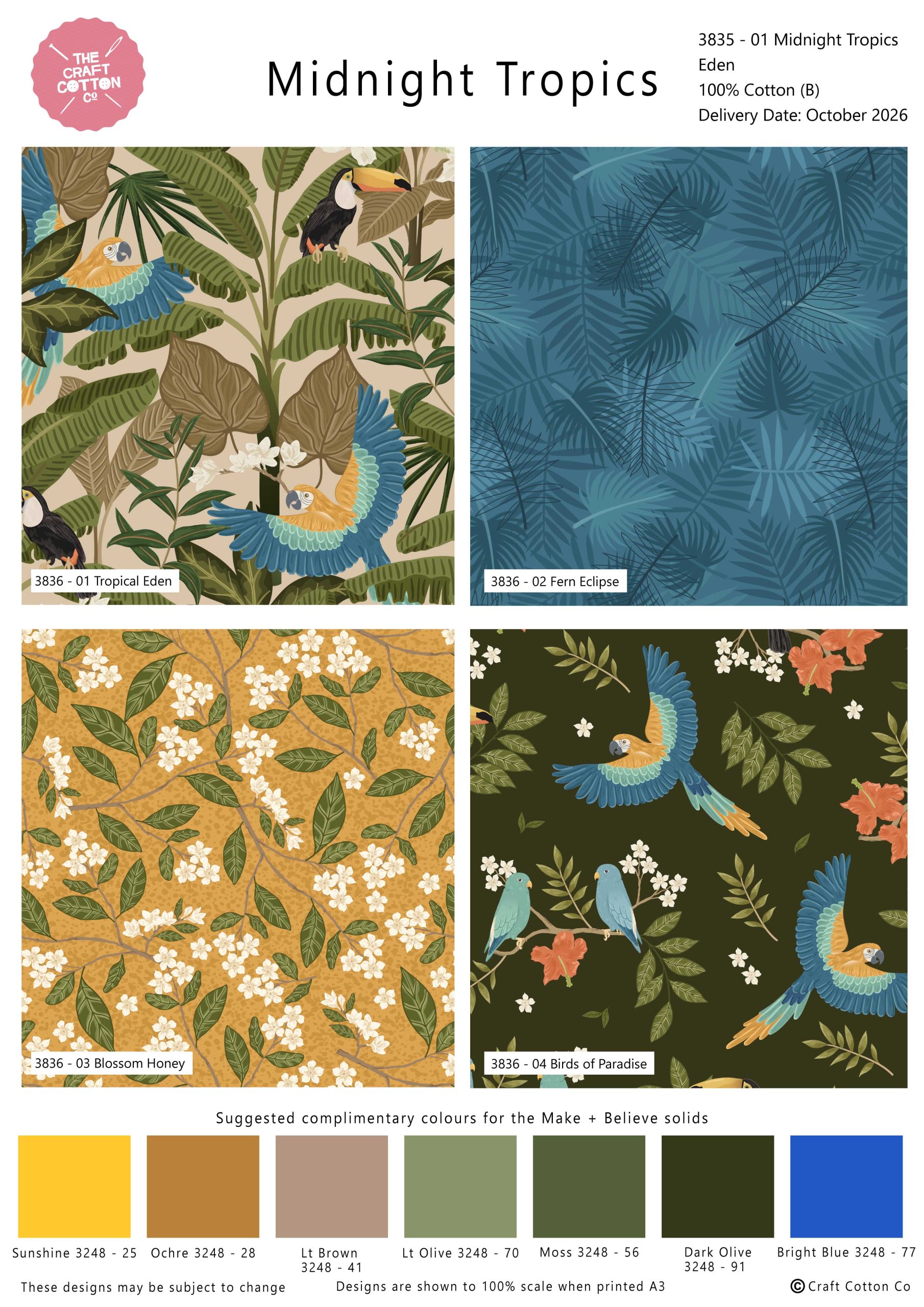 Escape to a lush, tropical paradise with the Midnight Tropics collection by The Craft Cotton Co. Inspired by exotic landscapes and vibrant wildlife, this striking range blends rich botanical detail with bold, expressive colour.