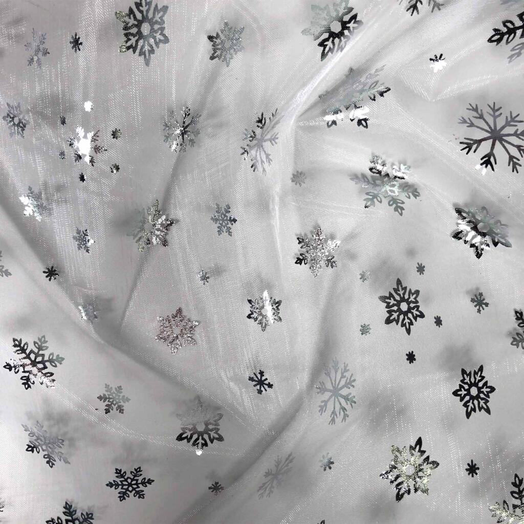 Light weight organza with foil snowflake design. Ideal for decoration, table dressing and displays.
